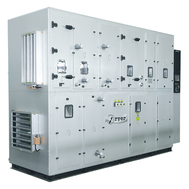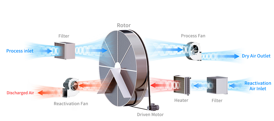 The process air pass through processing area and be dried by desiccant rotor, supply to treated area. The moisture remaining on the desiccant rotor, the saturated rotor turn to reactivation area, absorbed moisture on the rotor will be evaporated by hot air (100℃-120℃) heated by reactivation heater from outside, The wet air will be discharged to outside. The rotor become dry again for next circulation.