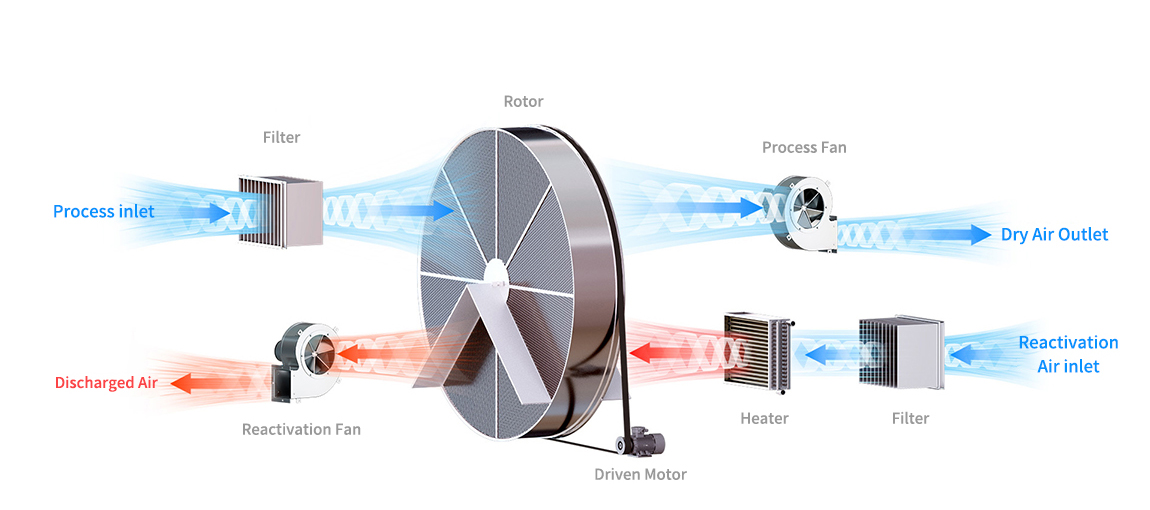 The process air pass through processing area and be dried by desiccant rotor, supply to treated area. The moisture remaining on the desiccant rotor, the saturated rotor turn to reactivation area, absorbed moisture on the rotor will be evaporated by hot air (100℃-120℃) heated by reactivation heater from outside. The wet air will be discharged to outside. The rotor become dry again for next circulation.